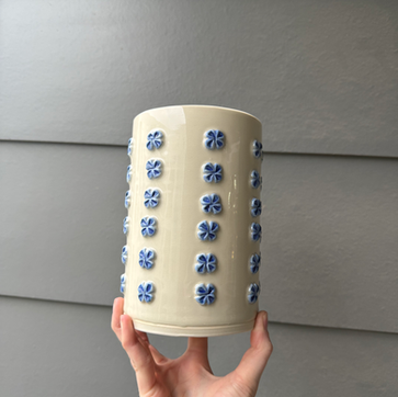 I make fun, functional, and decorative ceramics inspired by my upbringing in Austin and the different styles around me in my full-time job as a marketing manager in the music industry. My pieces have an interesting dichotomy between an edgy and playful, whimsical feel—think black and white pieces brought to life with bold floral textures and quirky hand-painted designs.
